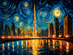 Soar into the skies with the tallest building on Earth reimagined in cosmic style. The Burj Khalifa Galaxy Diamond Painting Kit transforms Dubai’s futuristic skyline into a surreal night of swirling stars, golden light, and mirrored reflections on still waters.