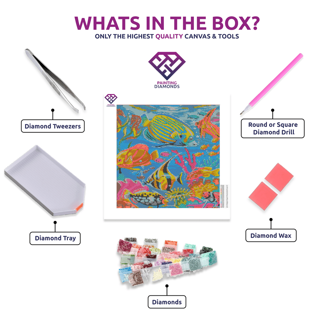 Fish in the Sea diamond painting kit available in 30x30cm, 40x40cm, 60x60cm, 80x80cm.