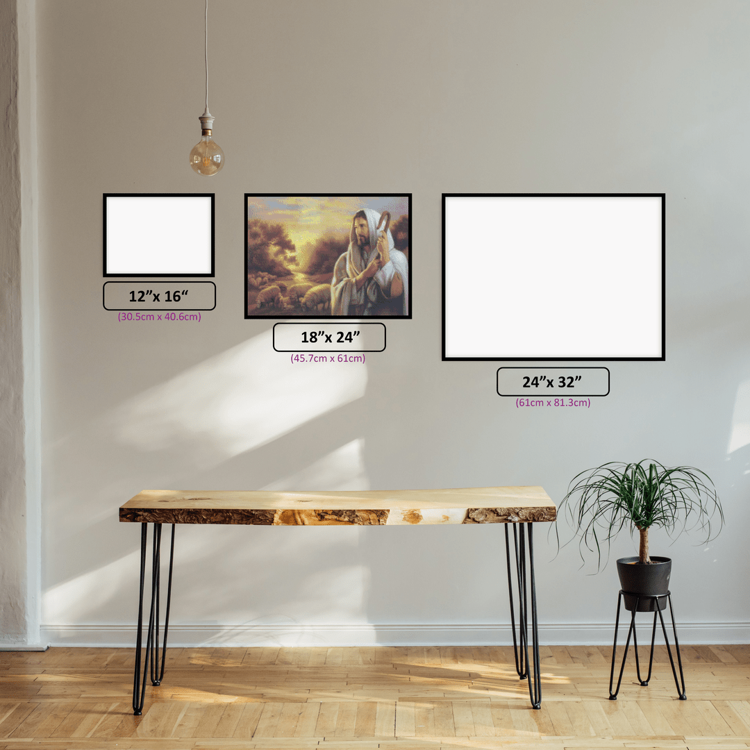 Jesus Shepherd diamond painting kit available in 30x40cm, 45x60cm, 60x80cm.