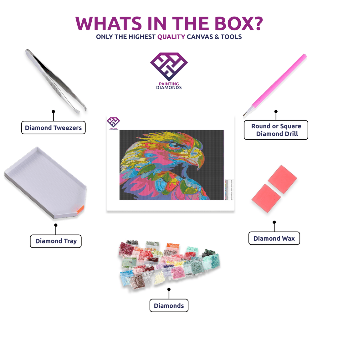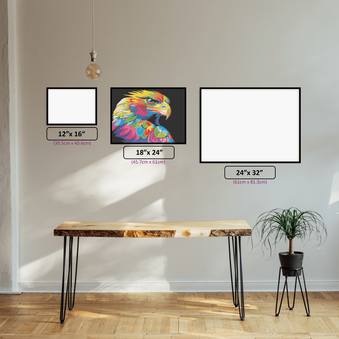 Colourful Eagle diamond painting kit available in 30x40cm, 45x60cm, 60x80cm.