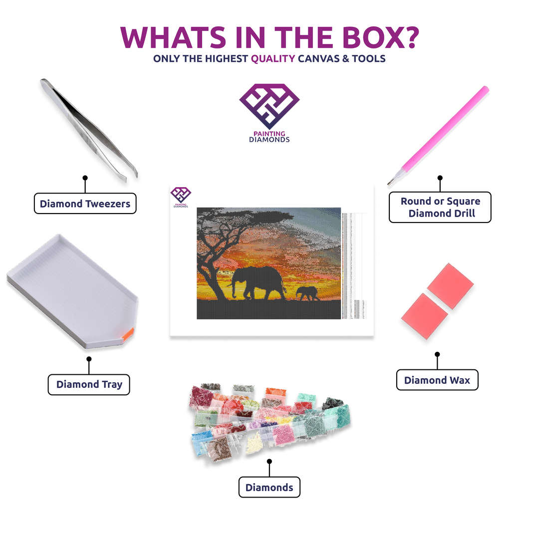 The Savannah, a breathtaking diamond painting kit showcasing a mother elephant and her calf against a vibrant sunset. This diamond painting kit is available in 30x40cm, 45x60cm, 60x80cm.