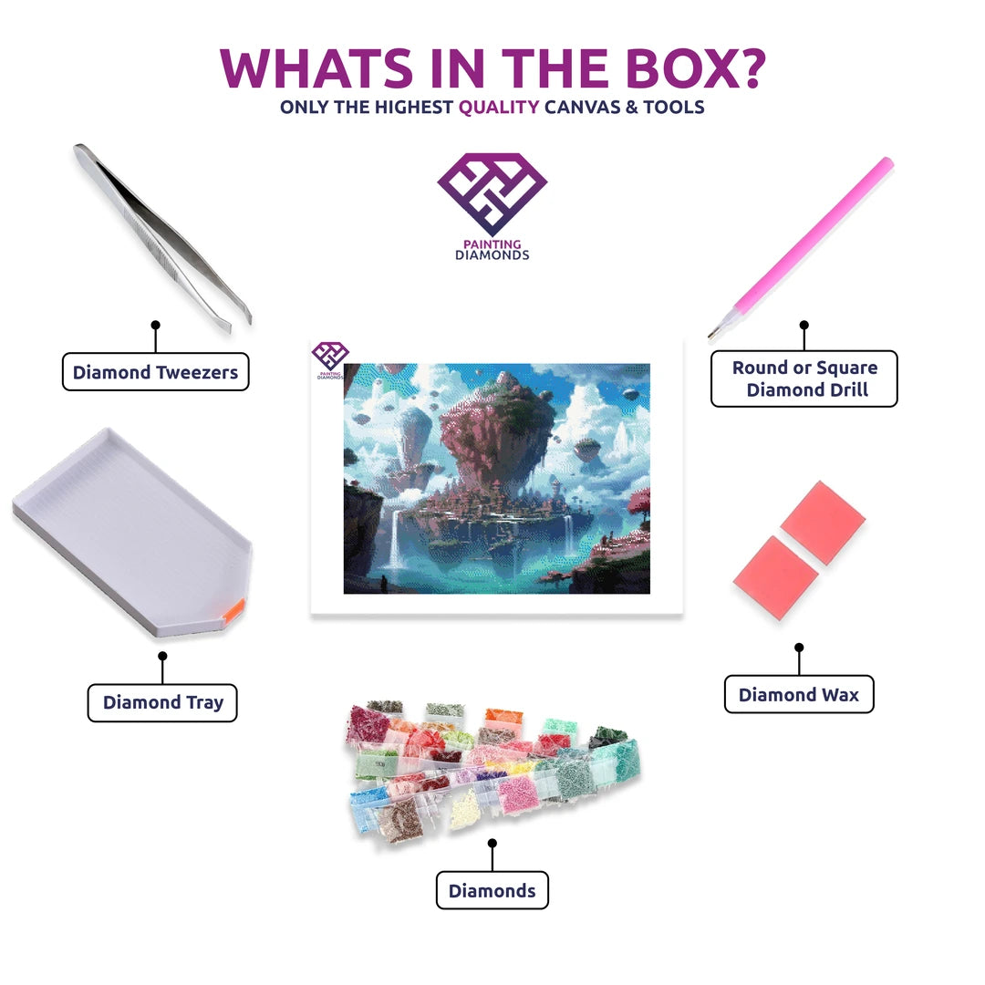 Journey into a whimsical fantasy with our "Dreamland" diamond painting. Floating islands against the backdrop of an azure sky, cascading sky-waterfalls, and a blend of fantastical creatures and landscapes that defy gravity – this piece, designed by the Painting Diamonds team, is truly a magical escape from reality.