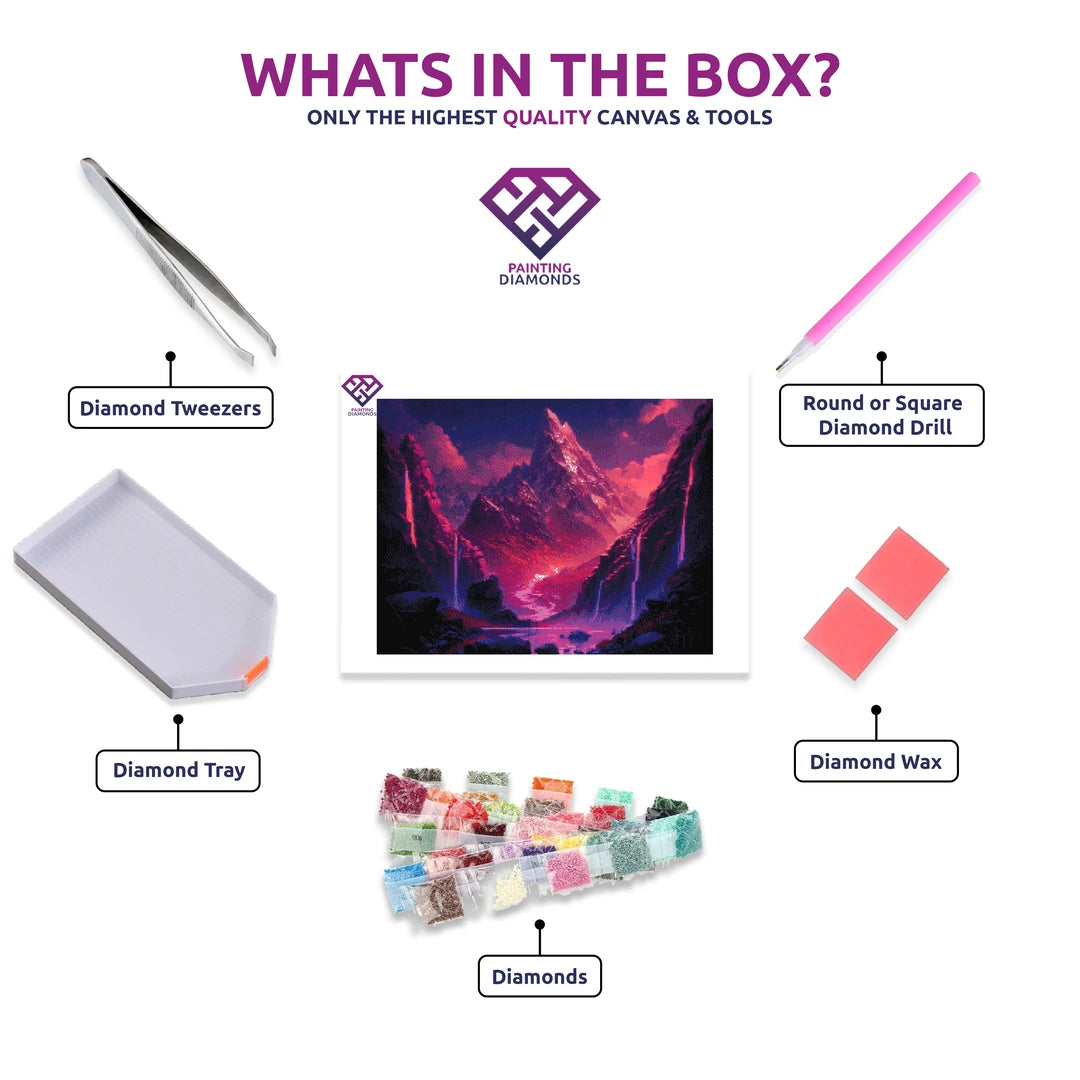 Embark on a journey to the realm of magic and mystery with our "Mystical Mountain Range" diamond painting. Designed by the talented artist ElieffAI, this extraordinary artwork captures the awe-inspiring beauty of a fantastical mountain range. The cascading glow of purple, neon orange, and pink light from the peaks creates a breathtaking scene that seems to defy reality. As you explore this majestic landscape, a hidden valley reveals an ancient, magical civilization untouched by time.