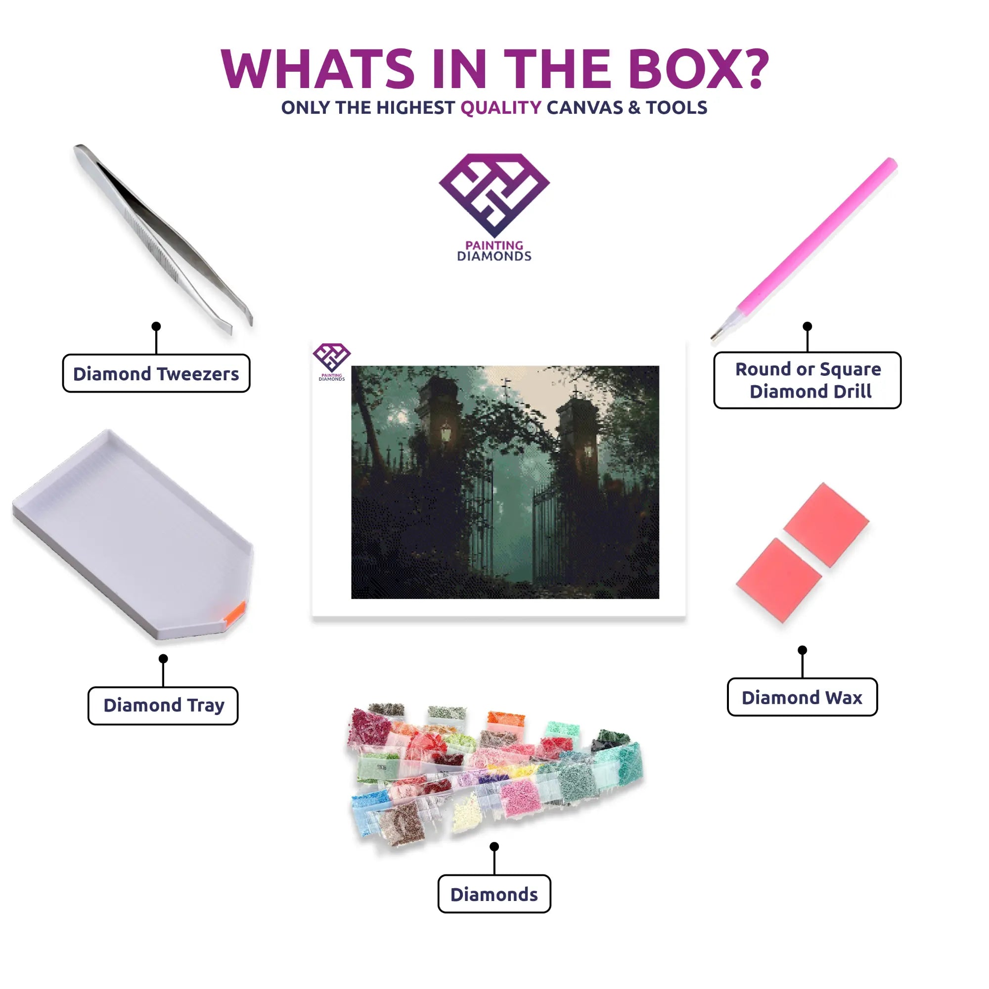 The example image is shown in 45x60cm, which perfectly captures the fine details of the gate and the creeping fog. For maximum impact, we recommend using this size or larger. With premium-quality diamonds and a hauntingly beautiful design, this Diamond Painting Kit is the perfect addition to your Halloween décor. Available only at Painting Diamonds, it’s a spooky masterpiece you won’t find anywhere else.