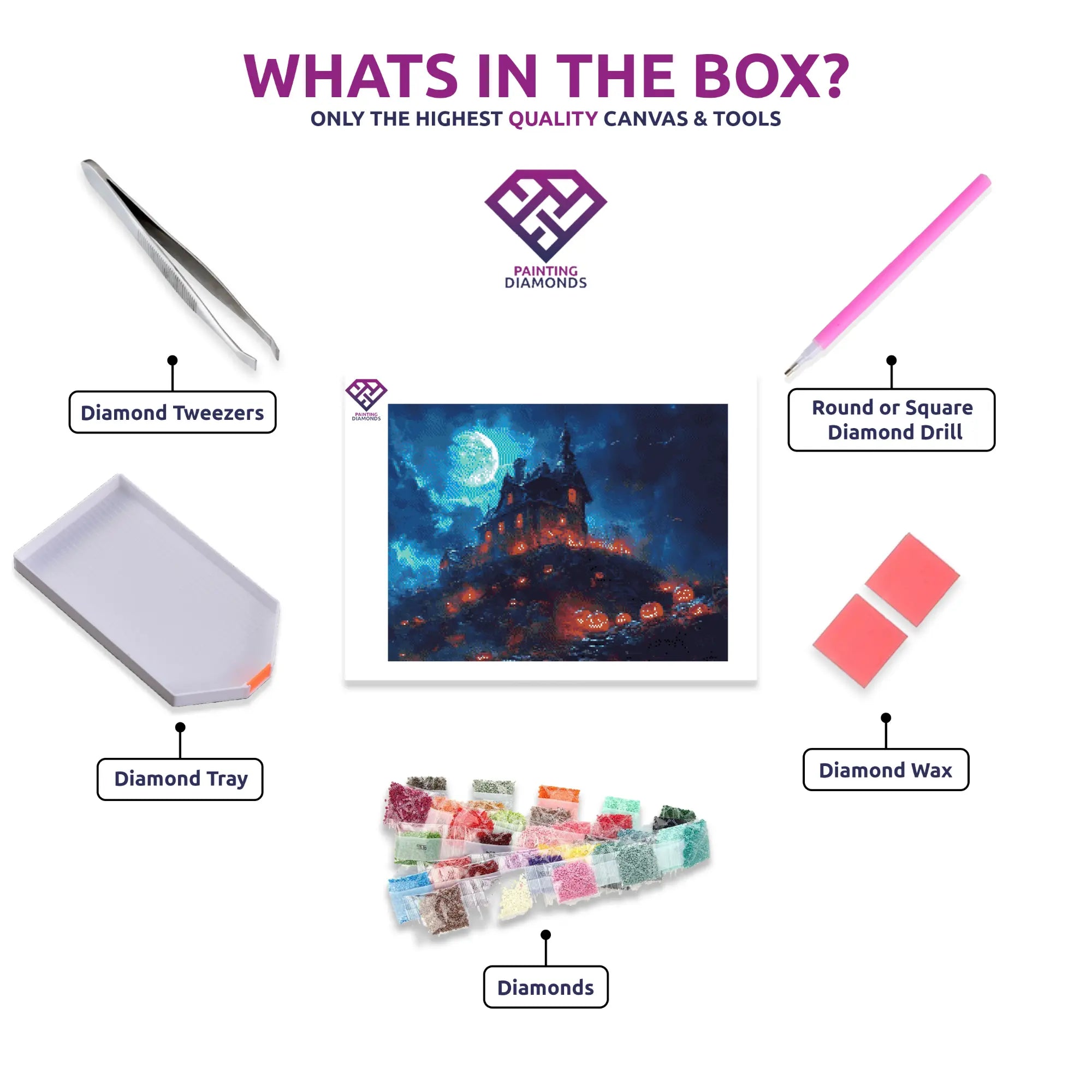 The example image is sized at 45x60cm, which allows for the perfect balance of detail and depth, making the haunting scene come alive. We recommend using this size or larger for maximum clarity and to bring out the intricate shadows and textures. Crafted with high-quality materials, this Diamond Painting Kit is a one-of-a-kind product, available only at Painting Diamonds. Add a spooky touch to your décor and experience the satisfaction of creating your own Halloween masterpiece.