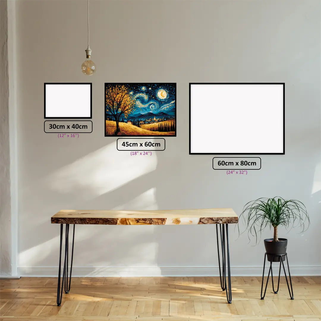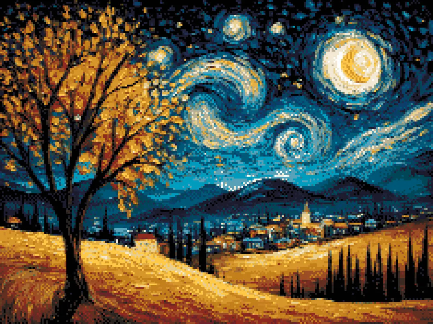 Bring the dreamy charm of Van Gogh-inspired skies to life with our Adelaide Hills Under Starry Skies Diamond Painting Kit. This exclusive artwork—only available at Painting Diamonds—captures a swirling celestial night above golden hills and a glowing countryside village, complete with a radiant autumn tree in the foreground.