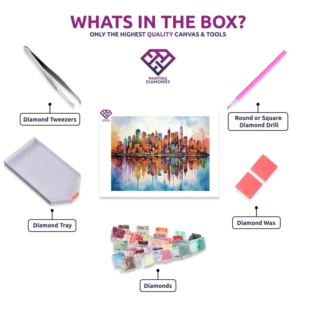 Journey through a vibrant metropolis with our exclusive Painting Diamonds 5D Diamond Painting Kit, "Colorful Cityscape". Let the city's rainbow-tinted skyline reflected in tranquil waters mesmerize you.
