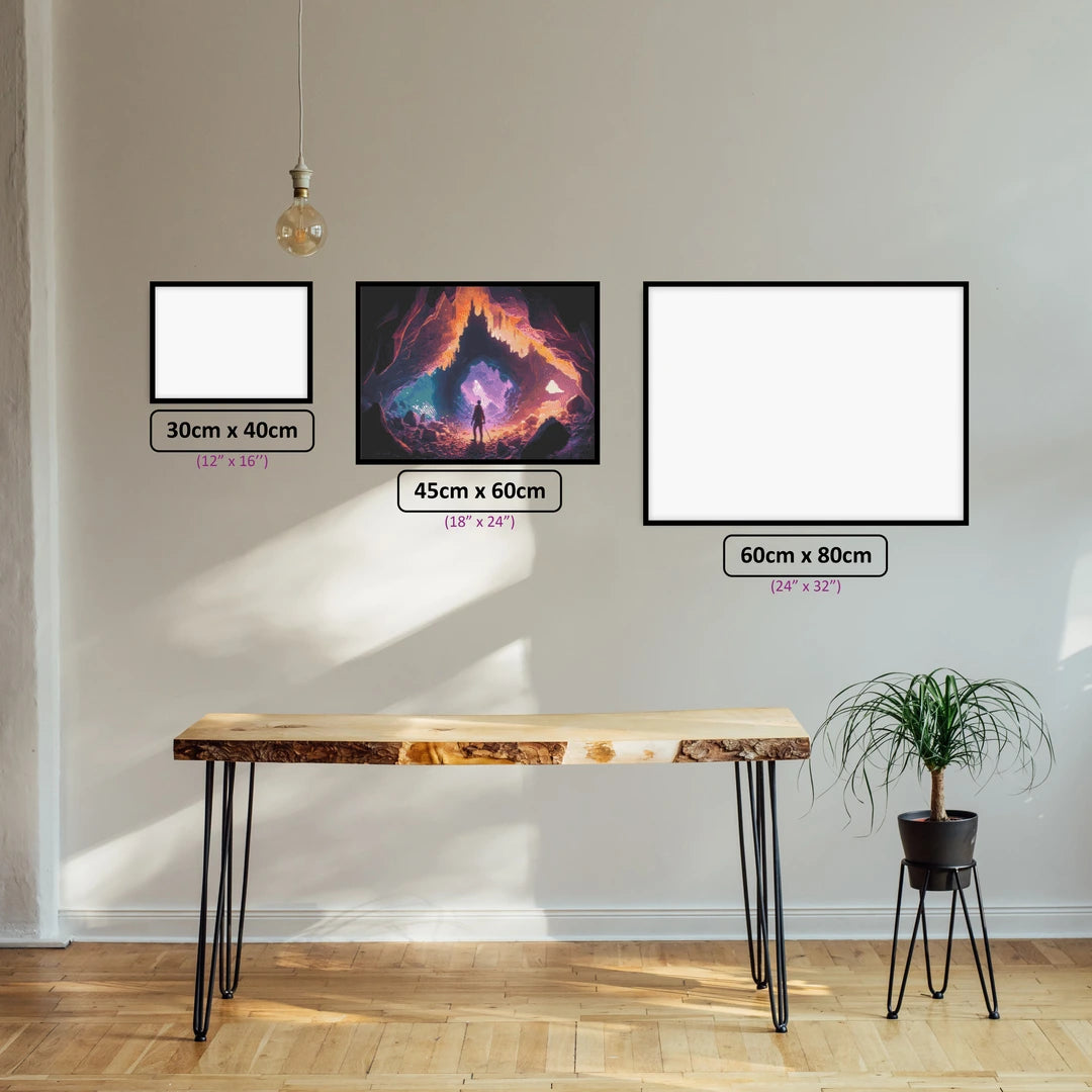 Embark on a magical journey with the Crystal Cave 5D Diamond Painting kit, an enchanting creation exclusive to Painting Diamonds, from the gifted artist ElieffAI. This mesmerizing piece transports you to a mysterious cave filled with glowing purple crystals and neon orange and pink stalactites hanging from the ceiling. A hidden underground lake, shimmering with an otherworldly light, reflects the vibrant colors on its surface.