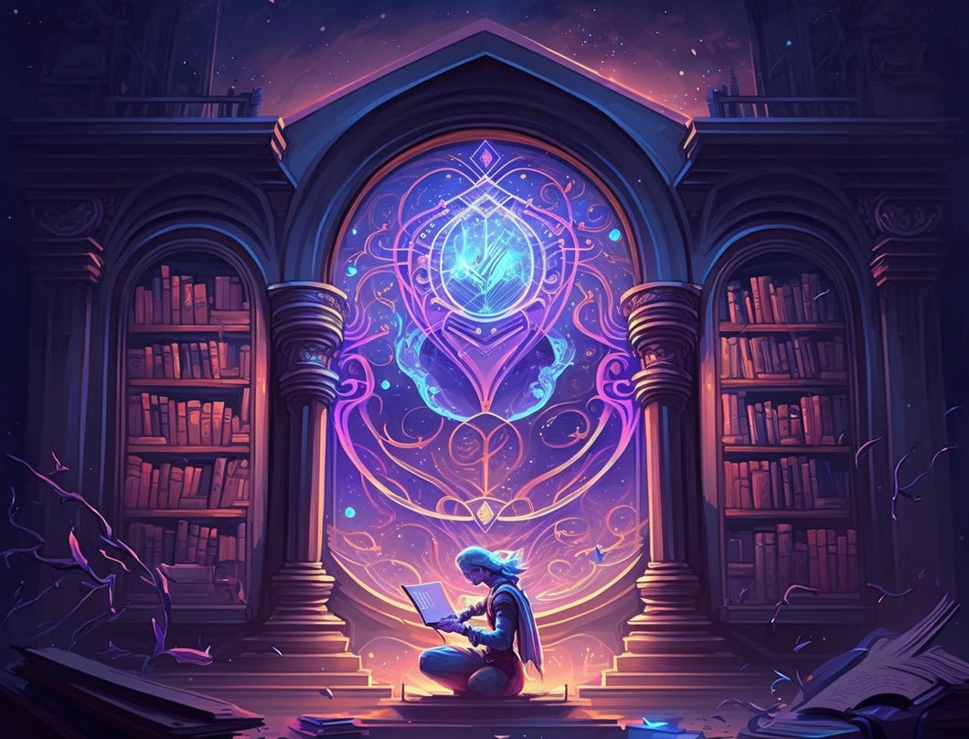 Discover the power of knowledge with this stunning 5D Diamond Painting kit exclusive to Painting Diamonds, from the brilliant artist ElieffAI. This thought-provoking piece showcases a grand, ancient library filled with glowing purple, neon orange, and pink illuminated manuscripts that hover in mid-air, revealing the secrets of the universe. The heart of the library emits an otherworldly blue light, which powers a mysterious, enchanted artifact.