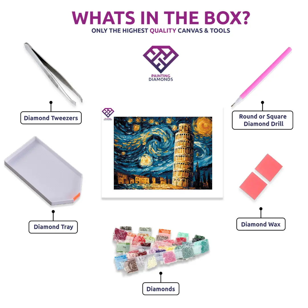 Travel to the heart of Tuscany with our Leaning Tower of Pisa Diamond Painting Kit, where Italy’s iconic architectural marvel tilts gently beneath a sky of swirling stars. This luminous scene combines the classic charm of European heritage with the whimsical brushstroke style reminiscent of Van Gogh. Golden buildings bask in twilight as the tower stands proudly illuminated, blending history, art, and magic into one unforgettable canvas.