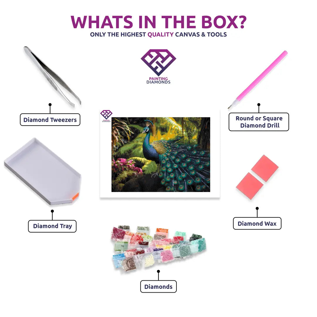 Embrace elegance with the "Peacock Splendour" Diamond Painting. An exclusive addition to the Painting Diamonds collection, this diamond painting unveils a peacock in all its radiant glory. As you embark on this Diamond Painting journey, each diamond will reflect nature's luxurious palette.