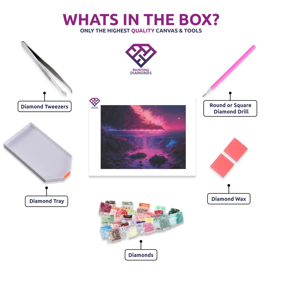 Dive into the unknown with our Toxic Waters 5D diamond painting kit. Crafted by ElieffAI, this captivating scene showcases a glowing purple reef, brought to life by streaks of neon orange and pink light. Nearby, the open ocean glows with an otherworldly light, captivating and mysterious.